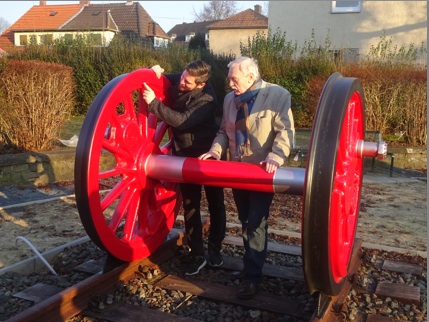 Das auf dem Bahnhofsplatz bereits vorhandene Schienenstück wird in naher Zukunft ergänzt um eine Antriebsachse der größten Güterzugdampflokomotive, die es je gab. Wenn alles gut läuft wird die Achse mit einem Durchmesser von zwei Metern noch in diesem Jahr ihren Weg von Meiningen nach Gremberghoven finden.