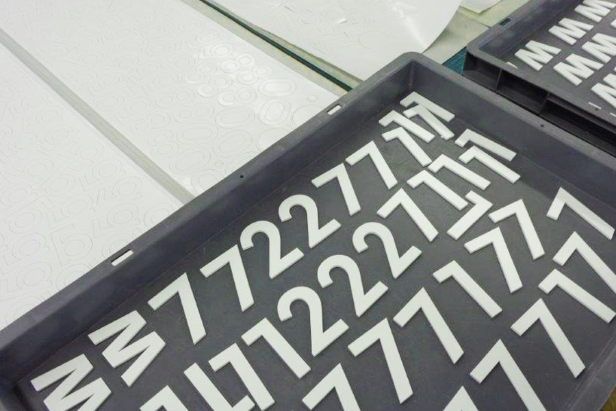 Die Buchstaben, Ziffern und Etagenpläne werden zunächst aus 3mm starken Acrylplatten gefräst. Im Anschluss werden diese Elemente in den festgelegten Farben (Rot, Blau oder Grün) lackiert. Wenn der Lack getrocknet ist, werden die Elemente nummeriert und in Schablonen aus Pappe gesetzt, um eine millimetergenaue Montage vor Ort vorzubereiten.
